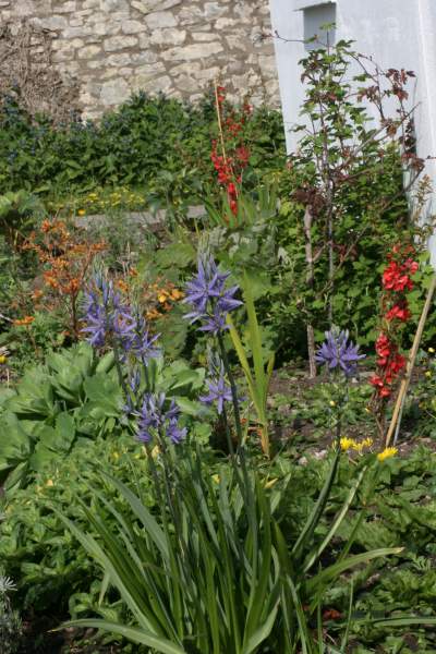 There's one plant in the Library Border that deserves a special mention: the giant Macleaya. Below is a series of pictures, the first taken in March where you can just about make out the stems that we cut down in winter. The other three photographs were taken in July, showing the plant growing halfway up the wall of the library, with a couple of close-ups, one including our volunteer Margaret as an indication of its height.