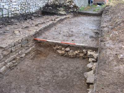 Excavations along the South Wall, showing the central 'pit' and the medieval wall.